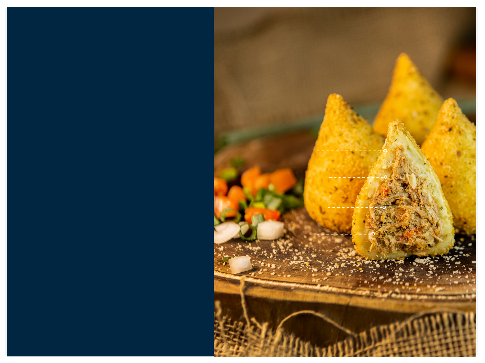 炸鸡肉面包绝对是巴西最受欢迎的小吃之 一,集市跟聚会下午茶的焦点!用法简单,味道丰富,搭 配咖啡、茶饮的绝妙选择。只需要稍稍处理,简单烘烤, 顷刻呈现正宗巴西风味。有四种口味可选!
